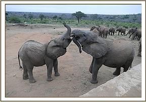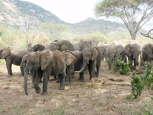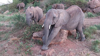 Vorige maand kwamen de jonge olifanten twee buffels tegen. De jonge dames Nabulu and Maisha schrokken hiervan en trokken zich terug. Galla en twee andere stiertjes vonden de buffels reuze interessant en voelden zich stoer genoeg om ze weg te jagen. Ze leken erg blij te zijn met hun succes.