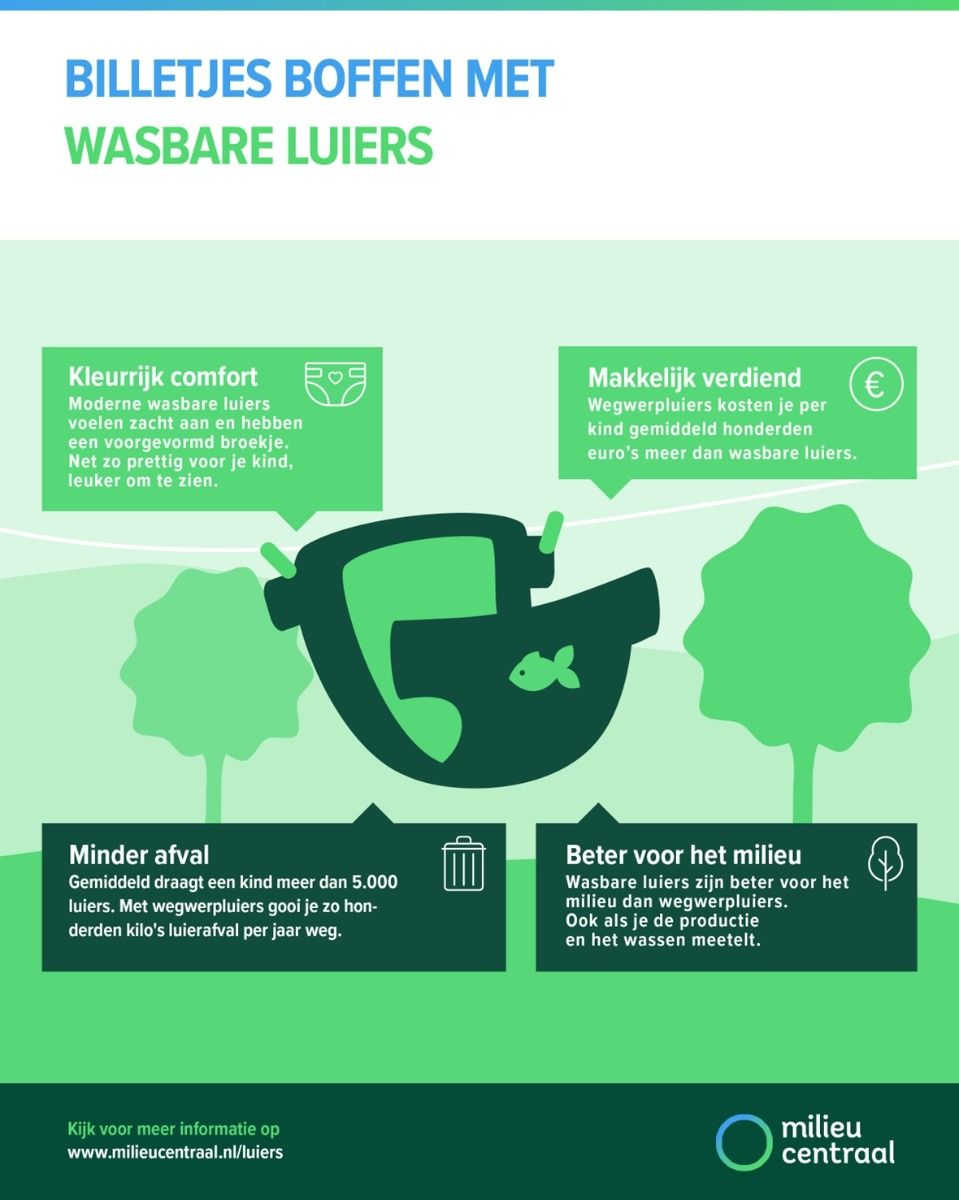 Wegwerpluiers zorgen voor 1 ton afval per kind, wasbare luiers zorgen nauwelijks voor afval. Mede hierdoor stoten wasbare luiers (zowel de productie als het wassen) 1,5 tot 2,5 keer minder CO2 uit dan wegwerpluiers. Daarnaast is er voor wasbare luiers 7 keer minder land nodig voor het produceren van de grondstoffen dan voor wegwerpluiers. Bovendien worden voor wegwerpluiers per kind 6 bomen gerooid en wordt 67 liter ruwe olie verwerkt tot plastic. En hoewel er tegenwoordig steeds meer wegwerpluiers apart worden ingezameld, is de recycle capaciteit zeer klein. De meeste apart ingezamelde wegwerpluiers worden alsnog verbrand. Dit is al tientallen jaren de situatie en zal ook niet zomaar veranderen. Luiers recyclen is een zeer complex, duur en energie-intensief proces terwijl de waarde van de gerecyclede producten nihil is. Verreweg de meeste wegwerpluiers worden verbrand, ondanks de belofte van Pampers en collega’s dat ze druk bezig zijn met het (in de toekomst) recyclen van wegwerpluiers.